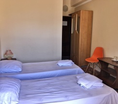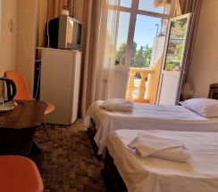 2х местный номер, с видом на посёлок; две односпальные; по запросу гостя в комментариях, кровати можно объединить топером в одну двуспальную; В номере есть сан узел с душем, косметические ванные принадлежности, фен, кондиционер, балкон, холодильник, чайник чашки, стулья в номере и стулья на балконе, столик журнальный, тумбочки прикроватные, шкаф для одежды