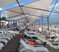 Пляж у отеля хороший, большой и оборудован всем необходимым. До него можно дойти пешком за три минуты.