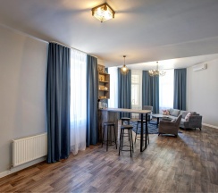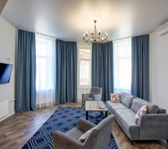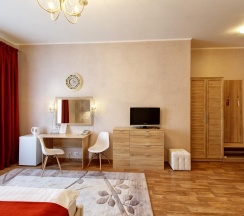 Апартаменты с комфортной зоной отдыха с большим обеденным столом, набором посуды, электрическим чайником. К вашему удобству спутниковое телевидение (более 130 каналов, в том числе на иностранных языках), двуспальная кровать king-size, джакузи, махровые халаты, набор туалетных принадлежностей, тапочки, бесплатный и платный бар в номере.