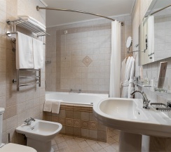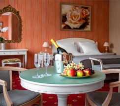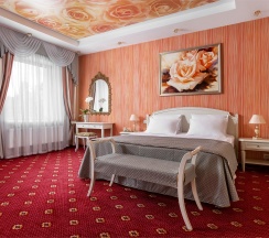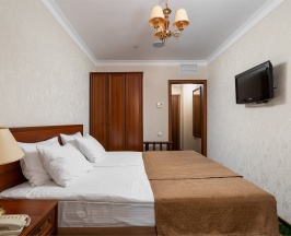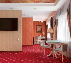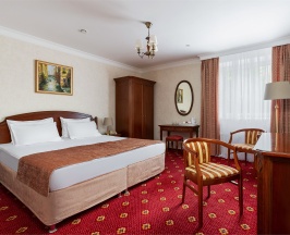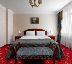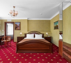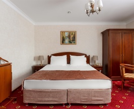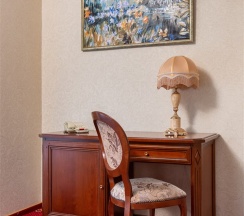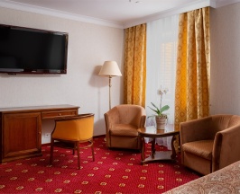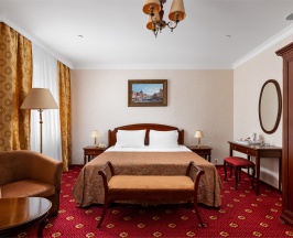 Лаконичный интерьер в классическом стиле. Кровать King Size в каждом номере для комфортного сна. Зона гостиной с письменным столом для продуктивной работы, кресла и журнальный столик для отдыха и приема гостей.