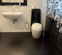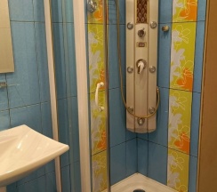 Из минусов- подиум у ванны. Т.к. ванна отдельностоящая и на этапе планировки, видимо, там не задумывалась, коммуникации пришлось закрыть высоким подиумом. Девушке среднего роста физически сложно забираться в достаточно ванну и выходить из нее, приходится сначала вставать на скользкий подиум.