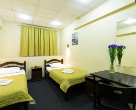 Уютный номер (13 кв. м.) с двумя односпальными кроватями, которые при желании легко сдвигаются. В номере отдельный санузел с душевой кабиной, шкаф для одежды, стол для работы, LCD-телевизор с USB-входом, мини-сейф, чайник.