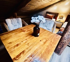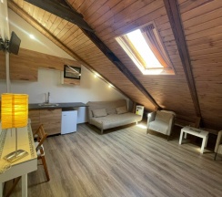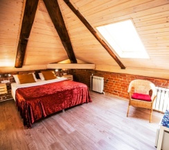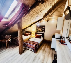 Номер на мансарде с 2 односпальными кроватями или одной большой кроватью. Оборудован ванной комнатой (душ), телевизором, феном. В номере есть платяной шкаф, прикроватные тумбочки, столик. В стоимость номера входит пользование вай-фай, бесплатный чай/кофе в столовой.