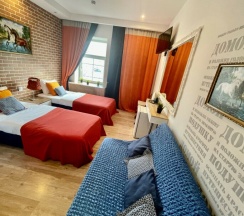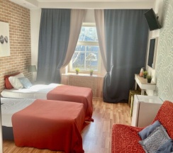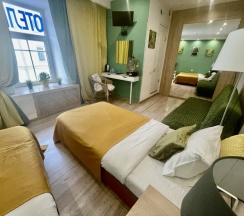 Номер с 1 двуспальной или 2 раздельными кроватями и 1 двуспальным раскладным диваном. Оборудован ванной комнатой (душ), телевизором, холодильником, феном и чайником. В номере есть платяной шкаф, прикроватные тумбочки, столик. В стоимость номера входит пользование вай-фай, бесплатный чай/кофе в столовой.