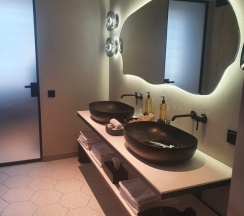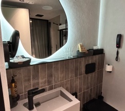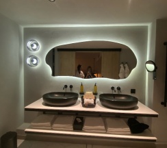 Ванная комната просторная, два умывальника, как раз для семейного отдыха с детьми. Персонал очень вежливый и услужливый, нужна была подставка под умывальник для младшего ребёнка, в течении 10 минут всё предоставили.. В общем отдельное им спасибо)