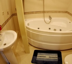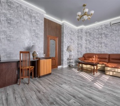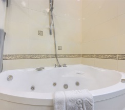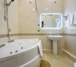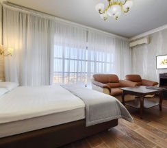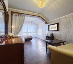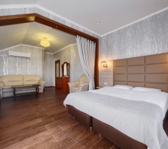 Эксклюзивный дизайн двухкомнатного номера люкс дарит ощущение VIP клиента. Просторная гостиная с большим кожаным диваном, журнальным столиком, и телевизором удобна не только для отдыха, но и для непринужденной встречи «без галстуков», а также необходимой работы в деловой поездке. Номер предназначен и для семейного размещения до четырех человек. Двуспальная кровать для родителей и раскладывающийся диван в гостиной для детей - удобное решение для полноценного отдыха семьи. Джакузи и климат контроль – особая привилегия в летнюю жару.