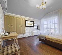 Изысканный дизайн каждого номера окунает в атмосферу роскоши и комфорта. Спальная зона с кроватью King Size отделена от просторной гостиной изящными шторами. Удобный кожаный диван располагает к дневному отдыху и просмотру любимых передач. Бесплатный Wi-Fi, климат контроль, неотъемлемые составляющие комфорта. Приняв душ, будет особым подарком после напряженного дня. Идеальный номер для двоих. Молодожены и романтики выбирают студио.