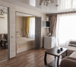 В номере Люкс за вполне демократичную цену вы получите в распоряжение 2 комнаты, в которых с комфортом разместиться семья из 5 человек, компания друзей или коллег.