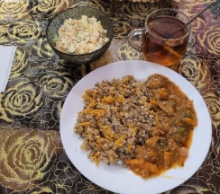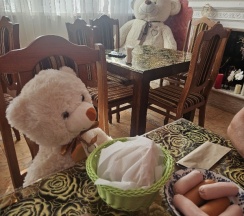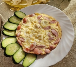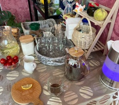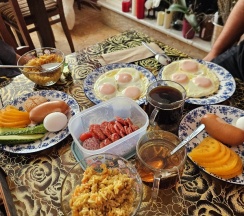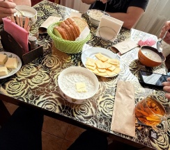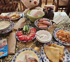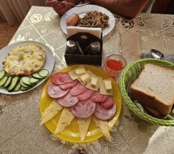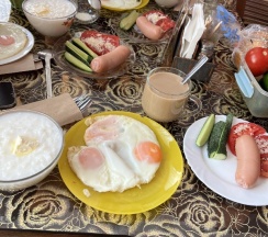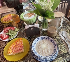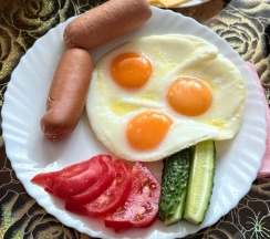 Ирина подала нам королевский завтрак!) Это была вкусная молочная каша, глазунья с сосисками и свежими помидорами, сыр, масло и копчёная колбаска) Чаи и кофе на выбор, сладости к чаепитию, а вечером были денька и арбузик. Детям было вкусно!)