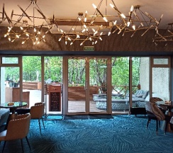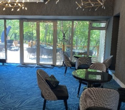 Каждый вечер здесь звучит живая музыка, а панорамные окна открывают прекрасный вид на природу — мы даже заметили белочек, прыгающих по деревьям! Завтрак был особенно хорош — шведский стол с разнообразными блюдами, который работает до 10:30.