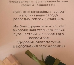 Отлично!!! Выезжали на мой день рождения (юбилей). Чистота, тишина, прекрасно оформленные общие помещения с новогодним дизайном. вежливый персонал. Все выше всяких похвал. Все понравилось. Номер шикарный с большим балконом. Чистое белье, в ванной достаточный набор полотенец и косметических принадлежностей (кстати в очень симпатичной, не похожей на упаковку в других отелях). Ресторан с разнообразной кухней и профессиональным, вежливым персоналом. Доставка в номер всех блюд. Получили подарок, так как заселялись на Новый год. Не критично, но все таки....(возможно суета праздничных дней повлияла) заказ был оформлен на меня, как главного гостя, отмечали день рождения мой , а подарок на столе стоял для мужа. Но это не омрачило, а скорее рассмешило (мужчина главный). Спасибо всем. Посетим при случае, я думаю, еще не один раз.