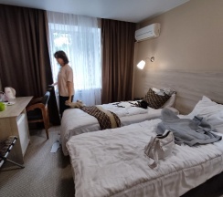 Гостиница недалеко от ЖД вокзала, рядом вся инфраструктура имеется, очень удобно. Номер был одноместный и трёхместный, все на высоком уровне. Особенно понравился завтрак (шведский стол) большое разнообразие и широкий выбор. Персонал вежливый. Знает свою работу