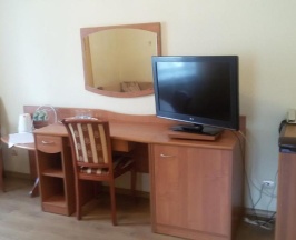 В номере: двуспальная кровать, прикроватные тумбы, письменный стол, чайник, телевизор, мини холодильник.
