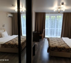 Приехали 3 октября , бронировала в приложении "отело" с 3 на 4 число, прилетели в хабарлвск в 23 вечера, позвонила подтвердить бронь, все в плрядке, нас ждали. Такси рублей 150 вышло. Номер стоимость 3400 вооьще отлично. Ехать 3 минуты от аэропорта. В гостинице частенько, и несмотря на всю скромность интерьера вае необходимое есть, бутфлированной воды нет в номерах, но на этаже кулер стоит. Мы Приехали за 15 минут до закрытия ресторана, хотели кушать после перелёта , думали нас уже не обслужат, но девочки на кухне все приняли приготовили и даже принесли в номер. Постель чистая , полотенца есть. Нам с мужем понравилось, утром уже улетели, для ночлега это прекрасная гостиница