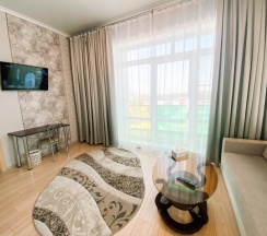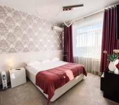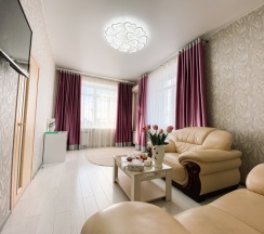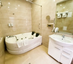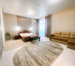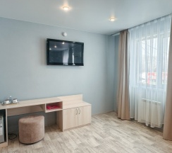 В номере имеется: двухспальная кровать (160*200), диван (расклад), рабочая зона, гостевая зона (журнальный стол), телевизор со спутниковым ТВ, холодильник, кондиционер, электрический чайник и чайные пары, шкаф собственная ванная комната, фен, ложка для обуви.