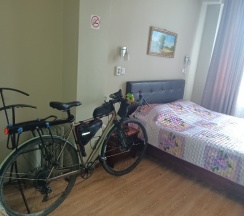 Хорошая гостиница. Чисто, уютно. Замечательный персонал. Есть кухня где можно приготовить себе покушать. Тоже чистая, приятно пахнет. Да, подремонтировать бы кое-где кое-что, но это мелочи. Гостиница и персонал дружелюбны к велосипедистам. Нам разрешили поднять велосипеды в номер. В номере просторно. Велосипеды вошли. Коридоры и лестница широкие, развернуться без проблем