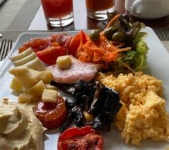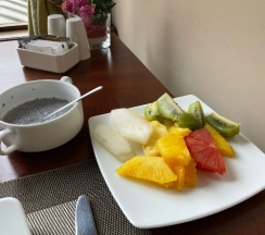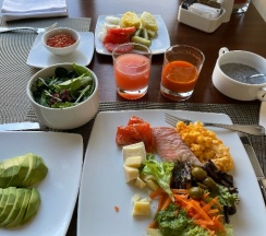 Начну с завтрака. Для меня это любимый прием пищи, отель я выбираю главным образом на базе отзывов о завтраке. Сначала мне показалось, что завтрак на 4.Зелень всего одного вида - листья салата. Авокадо нет совсем. Орехов нет совсем (арахис -не орехи), есть семечки тыквы, подсолнечника, льна, чиа. Каши только на молоке. Назову и плюсы: миндальное и кокосовое молоко. Помимо консервированных, есть вкусные свежие фрукты (ананас, киви, апельсин, грейпфрут, дыня, яблоки, груши, бананы, сливы). Мне сделали неплохо яйца Бенедикт с лососем. Разные виды сыров, лосось слабой соли. Свежевыжатый морковный, грейпфрутовый, апельсиновый соки. Потом я поменяла свою оценку на 5. Оказывается, нужно было просто спросить то, что хочется. Мне принесли ассорти зелени, авокадо, и даже красную икру. И приносили это мои 3 следующих дня в отеле, мне даже просить не пришлось. Два дня была конференция в отеле, народу было очень много. Тем не менее, очень быстро заново выкладывали еду, было в наличии все, что я обычно ем. Мне кажется, это хороший показатель качества процессов в ресторане.
