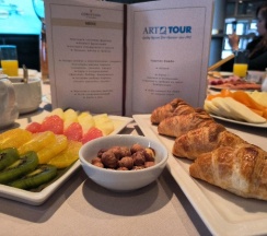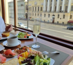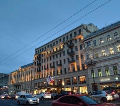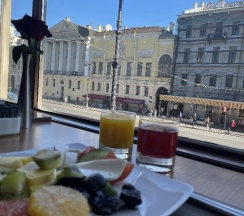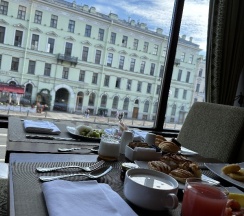 Отличное расположение, завтраки не брали, стоимость для проживающих 3000 рублей с человека, рядом есть кафе, в которых можно поесть, темноват интерьер, ресепшен и рум сервис отвечают через раз, при заявленной круглосуточной работе, в ванной очень мало света, почти невозможно качественно нанести макияж, есть пеню подушек! Удобная кровать, рекомендую брать номер с окнами во двор, Невский шумит, девушки на ресепшен приветливые и доброжелательные