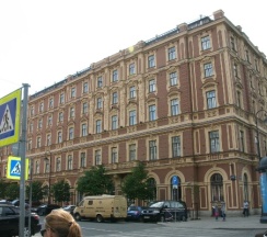 Еще в 1820-х годах на этом месте располагались дома купца А.С. Рогова и немца Г. Клее, содержавшего здесь трактир, где преимущественно останавливались иностранцы. Позже управление гостиницей и рестораном перешло к французу Ж.Л. Кулону. В 1830-х годах, в рамках создания ансамбля Михайловской улицы, архитекторы П.П. Жако и К.И. Росси перестроили фасады зданий, придав им единый классический облик. В середине XIX века гостиница Клее, получившая название «Россия», стала популярным местом среди путешественников – здесь в разное время проживали И.С. Тургенев, Т. Готье, М.И. Петипа и П.М. Третьяков.