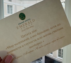 Проживание в Гранд отеле Эмеральд прошло комфортно, питание разнообразное, номера очень хорошие, поразил и впечатлил сервис: на прогулку выдают зонт на ресепшене, машину в каршеринге сами отгоняют, благодарю вас за отличную работу!