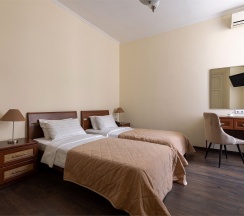 Очень приветливый персонал. В номерах все чистенько и уютно. Есть все удобства: ванная комната с феном, телевизор, кондиционер, холодильник, шкаф купе. У нас окна выходили во двор и это замечательно! Тихо, птички поют и никакого шума машин.