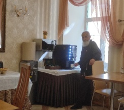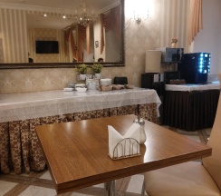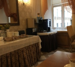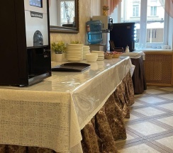В отеле есть столовая зона, чай, кофе, приборы, микроволновка, кулер. Я рекомендую отель "У Эрмитажа"