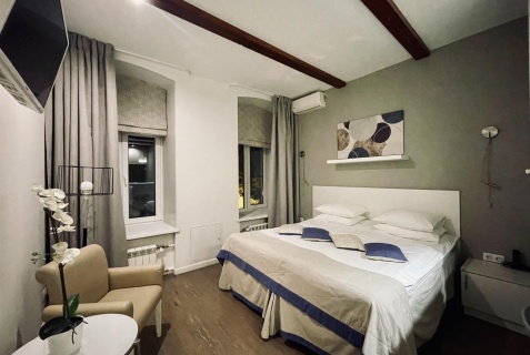 Комната включает в себя кровать kingsize, прикроватные тумбочки, доп. место (возможность размещения до 3х человек в номере), платяной шкаф, 2 светильника над кроватью, торшер, ЖК телевизор, кондиционер, мини-холодильник, тапочки, махровый халат, полотенце банное, полотенце для лица, коврик для ног, санузел в номере. В санузле: туалет, раковина, душевая кабина, косметический набор (гель для душа, шампунь), фен. Окна выходят на улицу Восстания или во двор. Номер 9-10 двухкомнатный, с закрывающейся дверью между комнатами (прекрасный вариант для семьи с ребенком), в номере 12 есть ванна-джакузи.