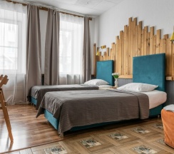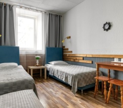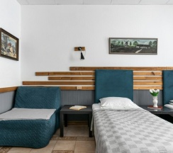 - комната площадью 16 кв.м., в которой две односпальных кровати (90х200). Телевизор с плоским экраном 32 дюйма, туалетный столик, зеркало, стол, шкаф для белья, диван или кресло, стулья, холодильник, чайник.
