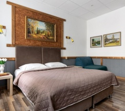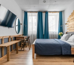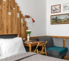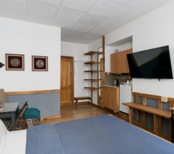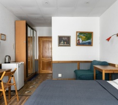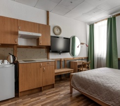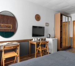 - Жилье повышенной комфортности площадью 16 кв.м., В комнате: двуспальная кровать (160х200). Телевизор с плоским экраном 40 дюйма, туалетный столик, зеркало, стол, шкаф для белья, диван, стулья, кухонная зона, холодильник, чайник.
