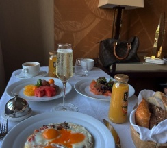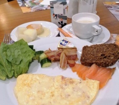 Завтрак отличный, шампанское и красная рыбка, можно самому отжать свежевыжатый сок! Кофе попросить и сварят на альтернативном молоке!
