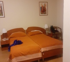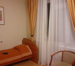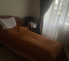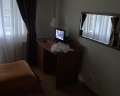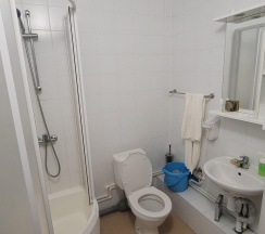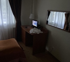Из недостатков: наш номер был на троих, но стаканов было только 2. В описании отеля было сказано о чайнике, в номере его не оказалось. Так же не было и чайных кружек. Мебель старенькая, но состояние хорошее. В пульте от телевизора стояли старые батарейки и он не работал. Телевизор маленький и стоит на столе. Конечно лучше когда он висит на стене. Так удобнее. На ресепшене сразу же предоставили батарейки, нашли где-то чайник и недостающие стаканы. Санузел совмещенный. Душевая кабинка.
