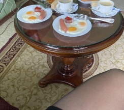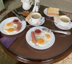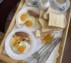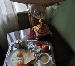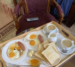 Завтрак 🍳 на выбор из 3 позиций в меню , мы всегда 2 номер выбирали для завтрака ( яичница, 2 тоста , масло , джем , чай , кофе ) . Завтрак приносят вовремя в номер в назначенное время заранее .