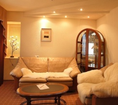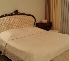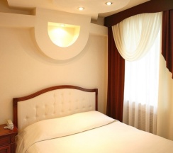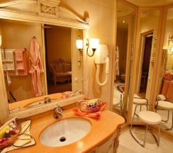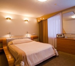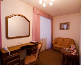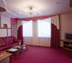 Стильный одноместный двухкомнатный номер, площадью 48 м2. Номеров такого класса в отеле - один, он расположен на втором этаже. В спальной комнате расположена большая двуспальная кровать, туалетный стол с большим зеркалом, подсветкой и мягким пуфиком, телевизор. В комнате для гостей располагается кожаная мягкая мебель, коллекционные обеденный и журнальный стеклянные столы, произведенные под заказ на итальянской фабрике. Данный номер Вас порадует наличием домашнего кинотеатра, с возможностью просмотра любимого фильма или прослушивания качественного в звуке музыкального шедевра. В каждой комнате есть телефон с городским номером. В номере имеется: ЖК телевизор с дистанционным управлением (40 каналов), мини-бар, платяной шкаф, кожаная мягкая мебель, имеется плед, оригинальная подсветка. Большая ванная комната с телефоном, ванной, умывальным гарнитуром, биде и унитазом. Возможна услуга размещения дополнительной персоны, как на основном спальном месте по тарифу "семейной пары", так и с дополнительным размещение в диванной зоне.