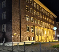 Здание гостиницы было построено в 1936 году для страхового общества "Северная звезда" по проекту архитекторов Зигфрида Зассника и Бруно Ляйдинга. Оно выполнено в стиле баухаус, который был популярен в Германии в 1930-е годы. Фасад облицован темно-красным клинкерным кирпичом с уникальным глянцевым отливом, что придает зданию сдержанный, но изысканный вид. Декоративные элементы, такие как крестообразные рельефные узоры и гербы Берлина и Кенигсберга, добавляют ему исторической значимости.