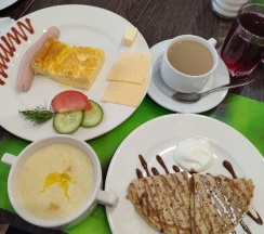 Удивило изобилие блюд на завтраке. Однако бОльшая часть еды всё жаренное-пережаренное, жирное. Для людей с проблемами ЖКТ и поджелудочной - выбрать, конечно, особо нечего.