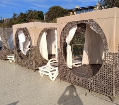О номерах. В первый приезд выбрали 109 в деревянном корпусе (тот, что под самой крышей, на третьем этаже). Топовый номер. Панорамный вид на море, шикарные закаты в лицо, безупречный санузел (есть и душевая кабина, и ванна), два огромных балкона. Тут обращусь к руководству отеля: замените уже кресла и стол на балконе, мы с ними 4 года встречаемся; пора бы мебель обновить… Со временем «Маяковский» застраивался, появлялись новые корпуса, а мы их тестировали. Успели пожить в глэмпинге, двухкомнатном джуниор сьют. И всё же наш предпочтительный номер – 109.