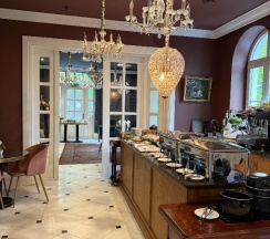 Завтрак разнообразен на напитки (от воды и соков до кофе и чая) и закуски (от шпрот, сосисок, сыра и печеного картофеля с овощами, до блинчиков, сырников и гранолы с топингами), ни взрослый ни ребёнок не уйдёт голодным.