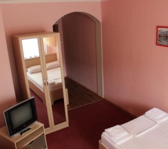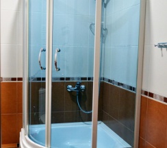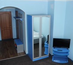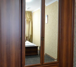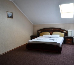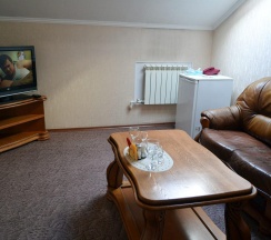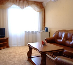 В номере две комнаты: спальня с 2-х спальным гарнитуром, кожаный угловой диван, телевизор, холодильник, журнальный стол, санузел с душевой кабиной.