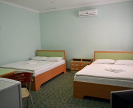 В номере две комнаты: 2 спальни с 2-х спальным гарнитуром, телевизор, холодильник, журнальный стол, санузел с душевой кабиной.