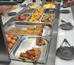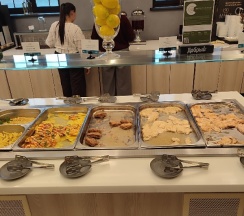Завтраки — просто праздник! Рыба, каши (целых три вида!), салаты, горячее, пироги, пицца… В общем, объедались каждый день. На этажах кулеры, утюг есть — удобно.