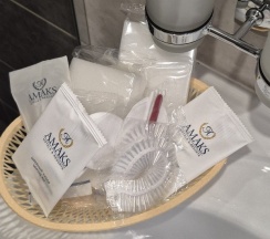 Исключительно скромные средства для мытья: жидкое мыло над раковиной и гель для душа в душе. Неизвестного производителя и весьма среднего качества. Ни шампуня, ни молочка для тела - ничего.