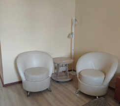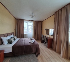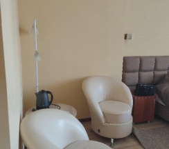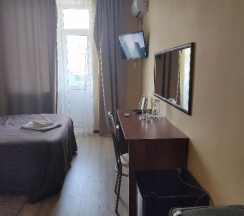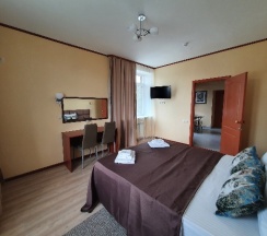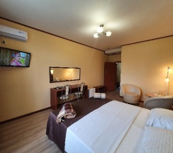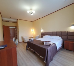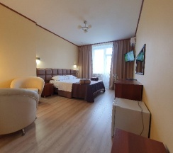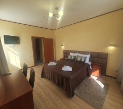 На нас из четырех человек был предоставлен номер с двумя комнатами,своим санузлом,душ, мини холодильник. В номере есть кувшин и стаканы, большая удобная кровать,два кресла и раскладной диван. Да за комплект постельного дополнительно доплатили 300 рублей. В основном было постельное на кровати, и два больших полотенца, четыре небольших (одно для рук и лица, второе для ног). В прихожей был шкаф и обувницей. Всё чисто: в номере есть балкон просто огромный. Место тихое - вокруг частные домики. В низу есть возможность приобрести завтрак и обед,если хотите,оплачивается всё на ресепшен. Меню фиксированное. На наш завтрак была каша рисовая молочная, яйцо отварное, батон и чай.