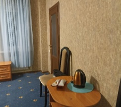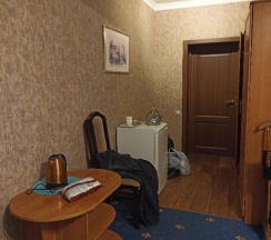 Очень хороший отель. Часто путешествуем, есть с чем сравнивать. В номере очень чисто, большая удобная кровать, в туалете душевая кабина, фен, туалетные принадлежности. В номере телевизор, холодильник, тапочки, халат. Ы номере тепло. Вариант завтрака выбираешь из 5, есть блинчики с мясом, каша, сырники, яичницу с сосисками. Нет кофе, есть чай. На этажах стоят кулеры, в номере есть чайник, ложки, чашки, стаканы. За номер с завтраком заплатили 2300. Перед отелем есть парковка на 6 машин.