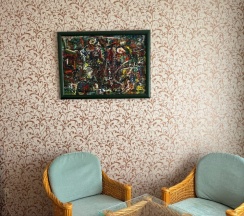 В коридорах необычный интерьер. Все сделано со вкусом и с любовь. Номера чистые, уютные. Рядом красивый дворик. Пруд. Птички поют. Очень приятное место.