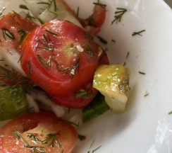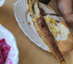 Вкусное жаркое ,картошка, вкусная лепешка и салаты ...Рыба старая и девочки даже не знают что такое морской язык , но это вообще речная рыба по итогу .Обман гостей.