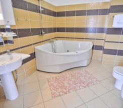 Номер люкс семейный включает в себя спальню и гостиную. В гостиной: 2 дивана, стол, плазменный телевизор, холодильник, сейф, кондиционер. В спальне: двуспальная кровать, прикроватные тумбочки, телефон, кресло. В ванной: джакузи, раковина, туалет, биде, косметические принадлежности, фен, комплект полотенец.