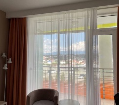 Взяли полулюкс с видом на горы (501): сам номер показался небольшим, но удобным, а вот балкон огромный около 40м2 с одним шезлонгом + стол и стулья (классно было вечерами сидеть с едой/вином/играми). Напор воды и температура идеальны! Кофемашина в номере!