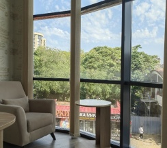 Так как рядом есть кафе и играет музыка окна хорошо изолируют звуки с улицы, а кондиционер хорошо охлаждает.