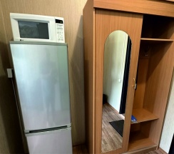 3 полуторные кровати, тумбочка, санузел с душевой, столик, чайник, телевизор, Wi-Fi. холодильник, микроволновая печь, кондиционер.