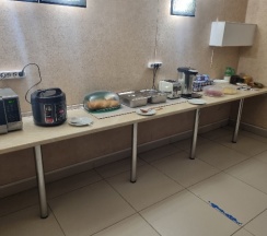 Шведский стол: каша, сосиски, макароны, варёное яйцо, чай/кофе, хлопья, молоко, плавленый сыр, масло, сыр колбаса, тостер)